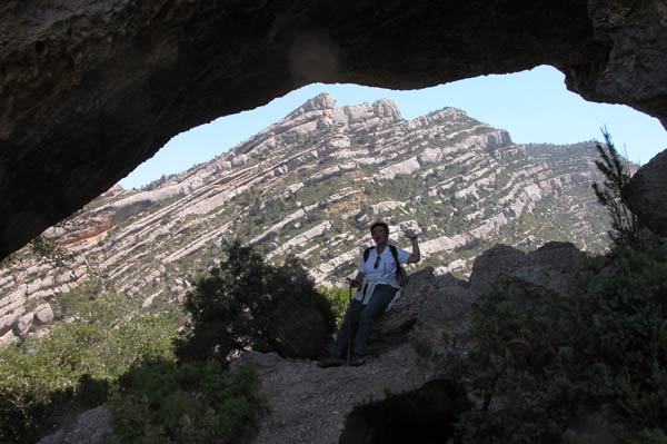 Por fin , despues de unas 2 horas de andar llegamos al Pont Natural. Un gran agujero con forma de puente en una gran pared de roca Al fondo puede verse enmarcado por el Puente La Montaña dels Ventadors